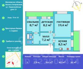 56,6 м², 3-комн., 8/16 этаж
