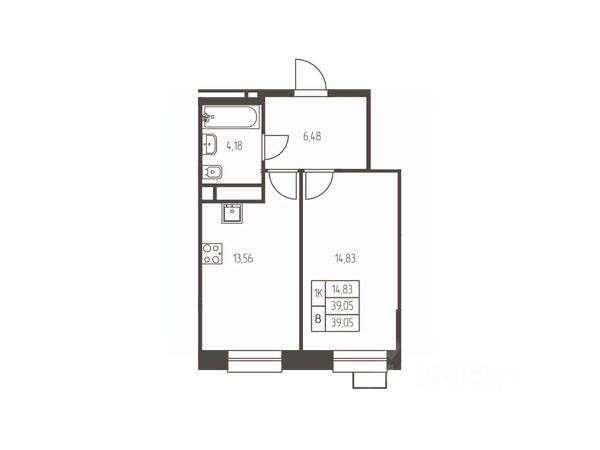 Площадь — 38,6 м², включая 2 (!) просторных остеклённых балкона: один выходит из кухни, второй — из комнаты.