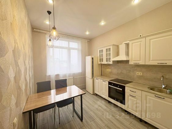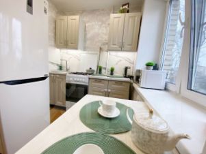 Остаётся: встроенная кухня с техникой (стеклокерамическая плита, духовой шкаф, вытяжка, посудомоечная машина, холодильник), стиральная машина, большая кровать, шторы, зеркало с подсветкой — можно не тратиться на обустройство.