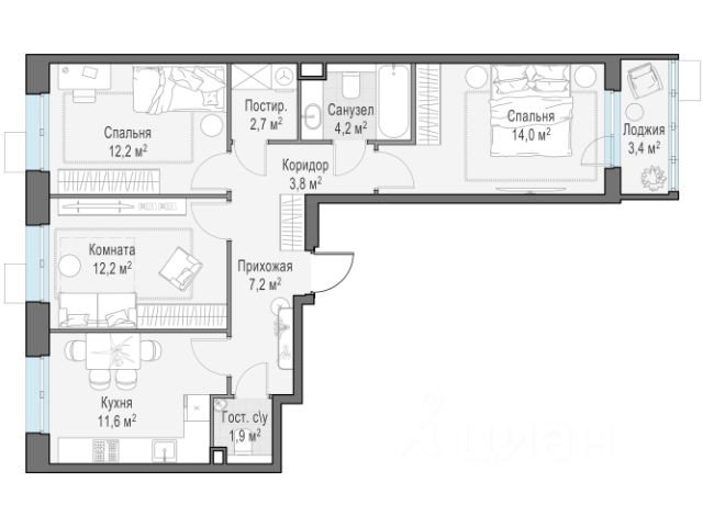 - спальная детская: односпальная кровать, шкаф-купе, рабочее место, кондиционер;