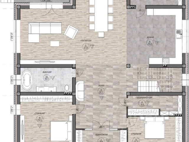 По 1 и частично 2 этажу сделаны тёплые полы. Все помещения готовы для укладки плитки или паркета.