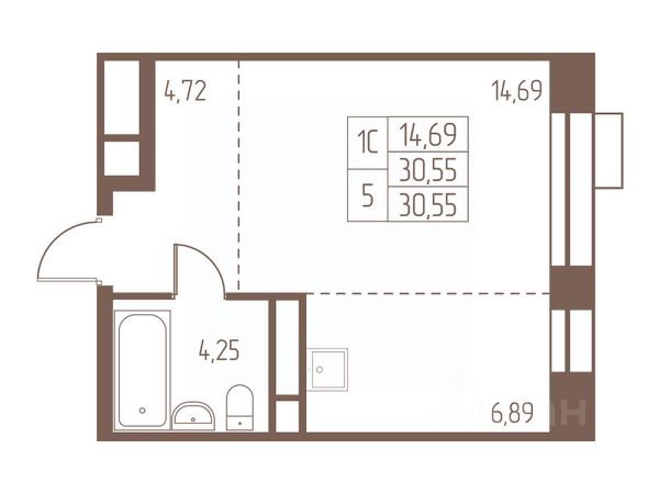 Квартира светлая, общая площадь — 24,5 кв. м., жилая - 11,5, кухня - 5 (соответсвенно общая площадь комнаты с кухней = 16,5 кв. метров), коридор - 4 кв. метра, санузел - 4,5 (увеличенный), дом находится в благоустроенном районе города.