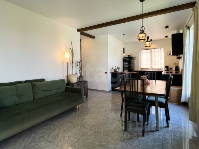 Большая кухня-гостинная, две спальни, кабинет и бойлерная с дополнительным санузлом.